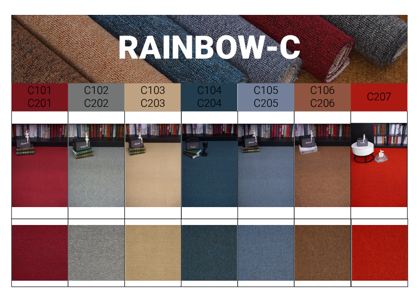 Với khả năng đáp ứng tốt cả về công năng lẫn thẩm mỹ, thảm cuộn Rainbow-C là giải pháp lý tưởng cho các công trình cần không gian chuyên nghiệp, sạch sẽ và bền đẹp, đồng thời tối ưu chi phí đầu tư lâu dài.