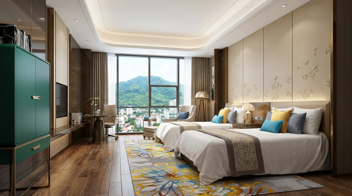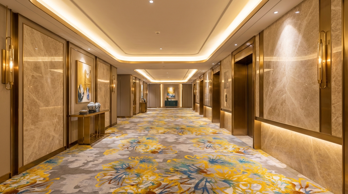 Mẫu thảm này thường được dùng cho phòng ngủ hoặc không gian chung của khách sạn 3–4 sao, nơi cần sự sang nhã nhưng không quá cầu kỳ.