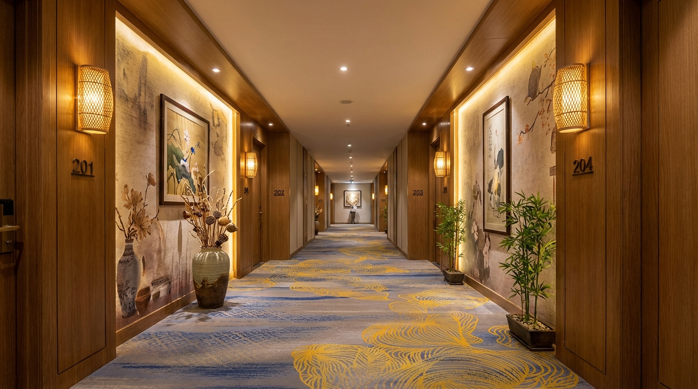 Thảm hành lang khách sạn chịu tải cao che bẩn tốt – Giải pháp tối ưu cho khách sạn 3–5 sao