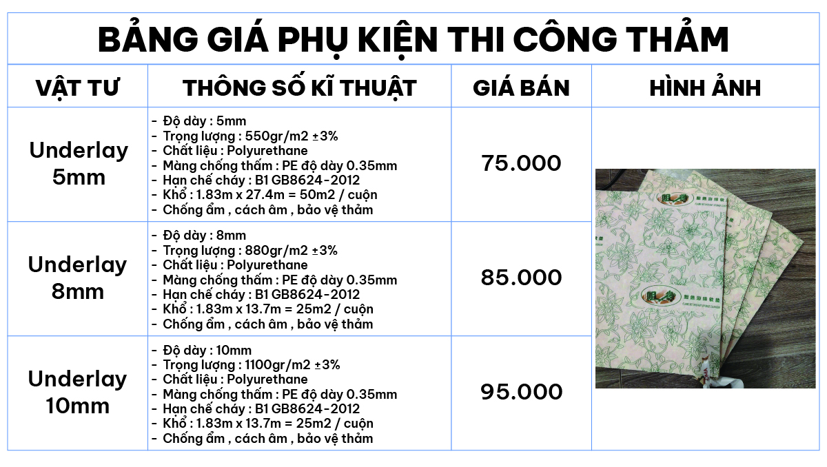 Đối với các công trình cao cấp thi công thảm 2 lớp không thể thiếu các vật tư, phụ kiện di kèm là lớp lót (underlay) và nẹp định, băng keo. Thảm Thanh Hà rất vinh dự được cung cấp tới quý khách hàng các loại vật tư này.