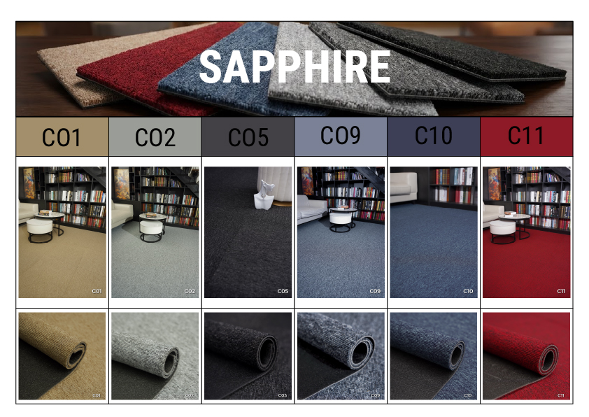 Sự kết hợp giữa chất liệu PP bền bỉ, cấu trúc sợi bện vòng và thiết kế hiện đại giúp thảm tấm SAPPHIRE trở thành giải pháp thảm trải sàn hiệu quả, đáp ứng tốt cả về thẩm mỹ – công năng – chi phí cho nhiều loại công trình.