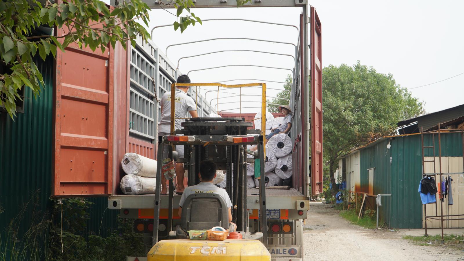 Vận chuyển hàng hoá các thảm cuộn bằng xe nâng chuyên dụng