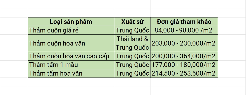 4. BẢNG GIÁ THAM KHẢO TẠI KHO THẢM THANH HÀ (TP.HCM)